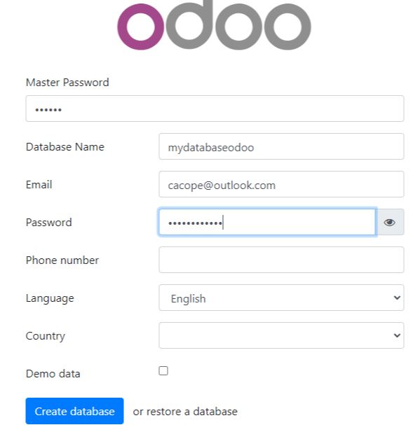 Y en Master Password vamos a colocar la clave que configuramos en el paso 3 OE_SUPERADMIN="Clav3-201a", damos el nombre que queramos a nuestra base de datos en Database Name y luego simplemente llenamos todos los datos que nos solicitan.